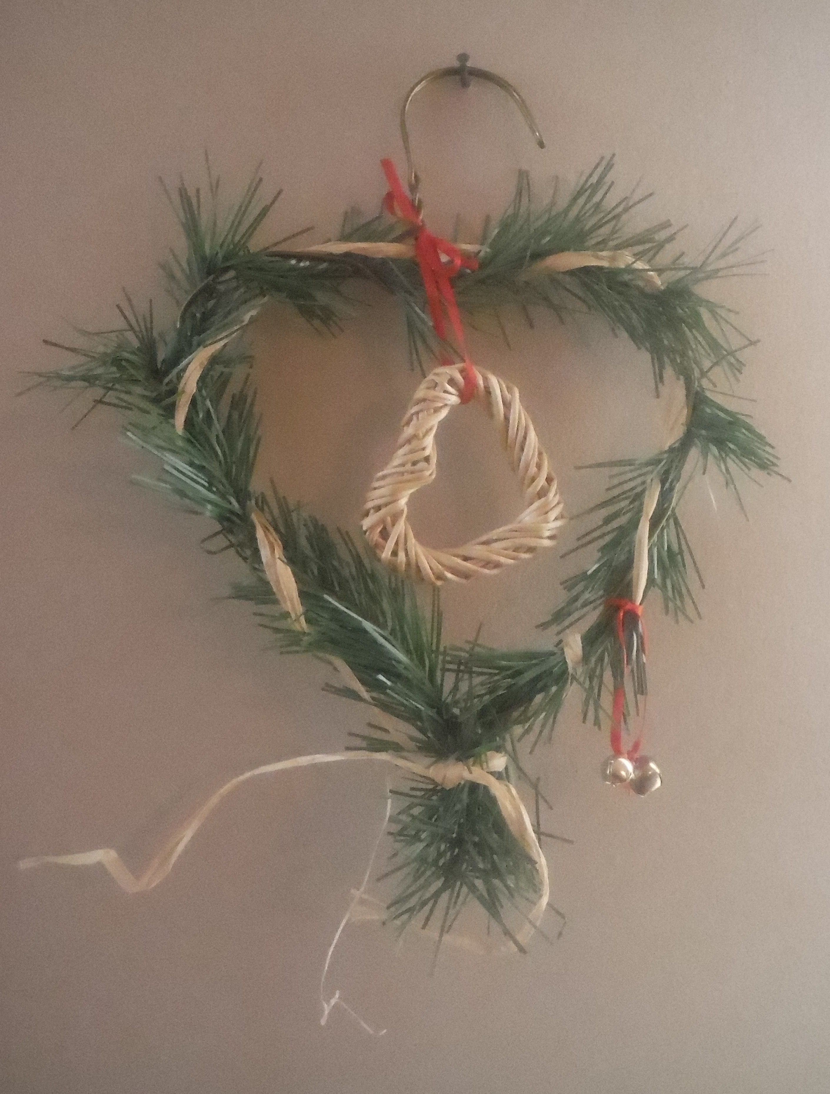 Small heart-shaped wreath, approximately 8″ decorated with evergreen twigs, ribbon, raffia, bells, and dangling wicker heart