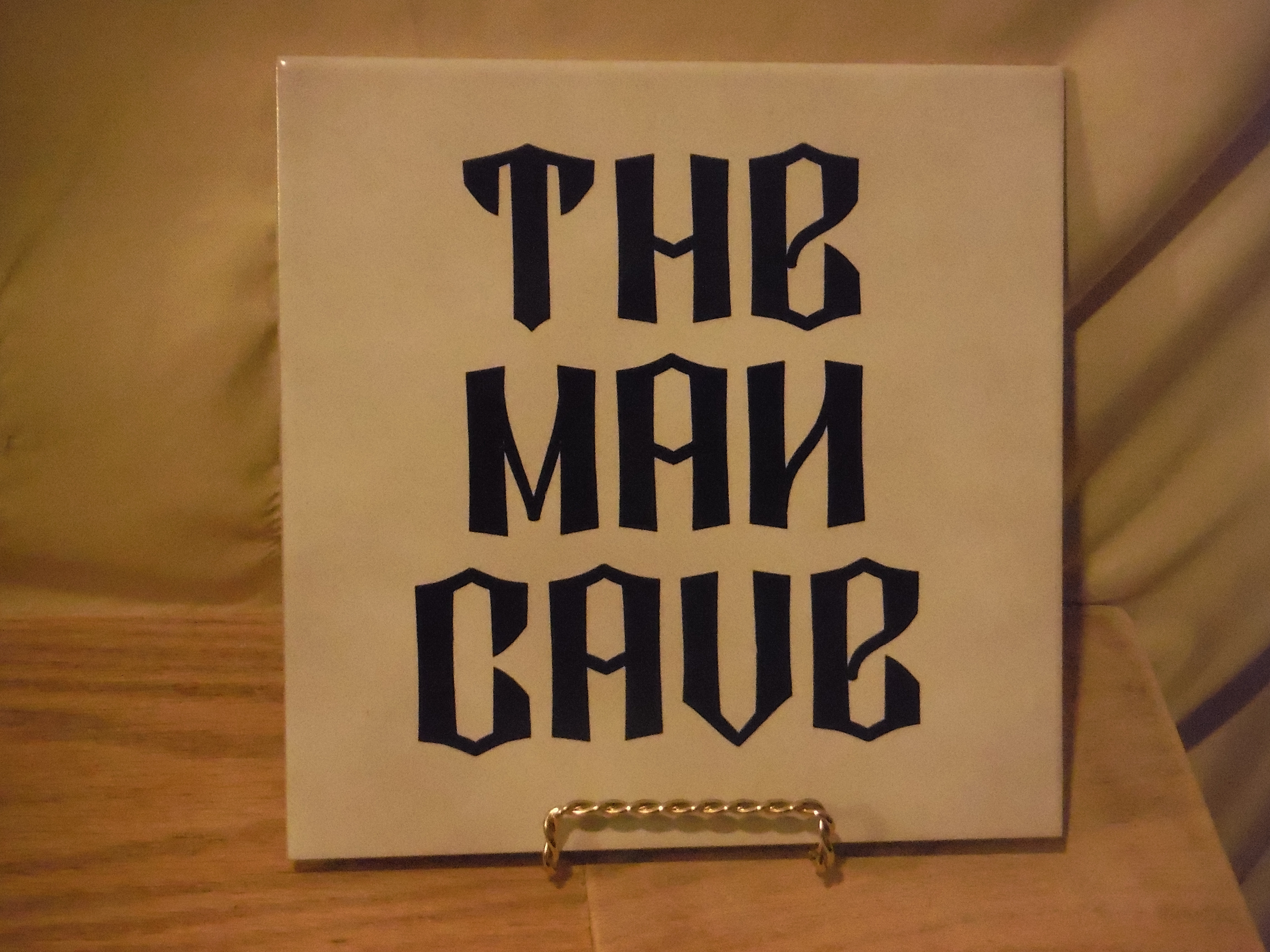 Off-white tile with black lettering, padded bottom for placement on table, or rest in a plate rack/easel (not included). Remove the pads and you could even tile it to your wall or other surface. Handwash only.