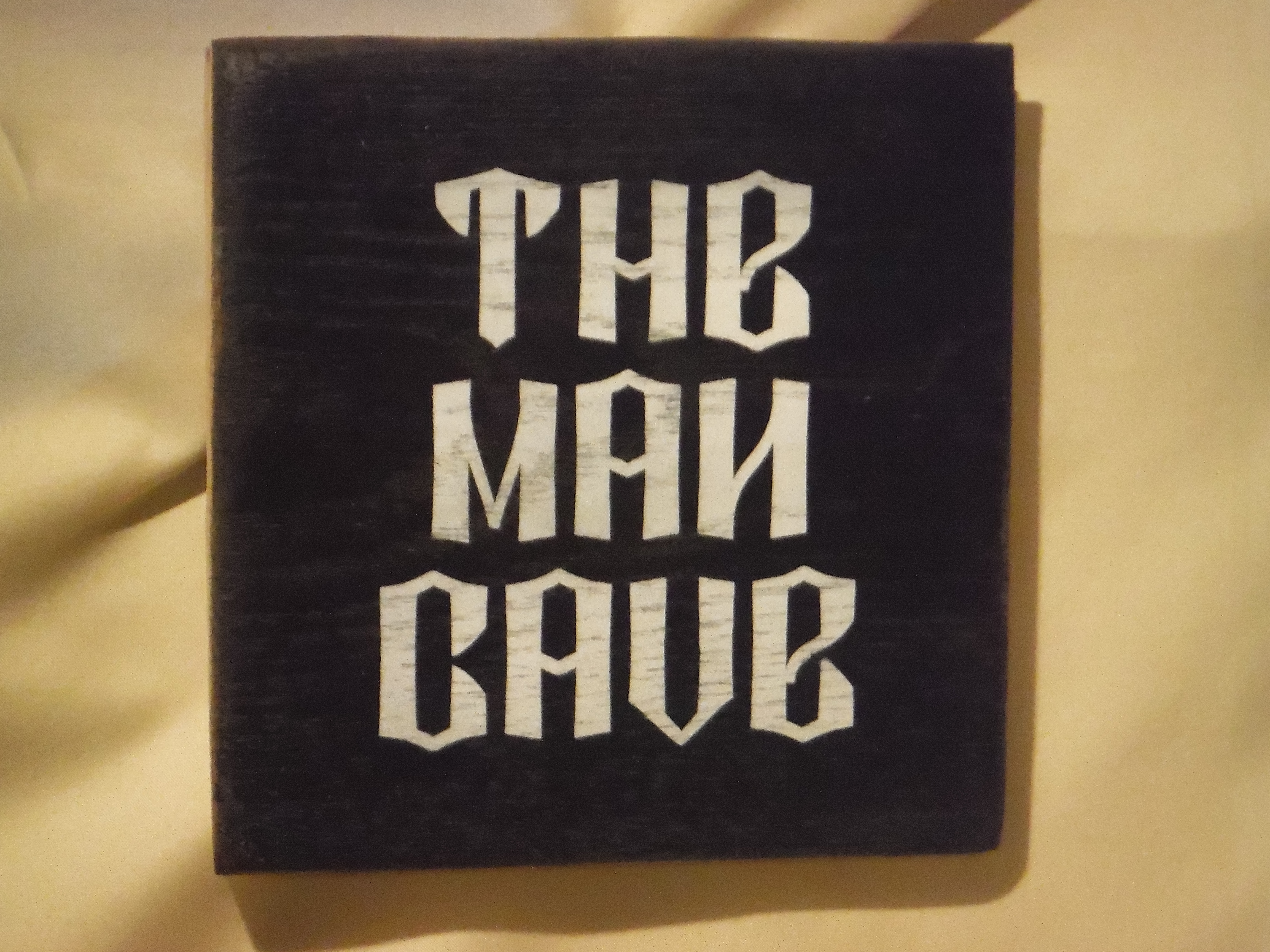 THE MAN CAVE 6″ wood block Black with white lettering. Saw tooth hanger on back .